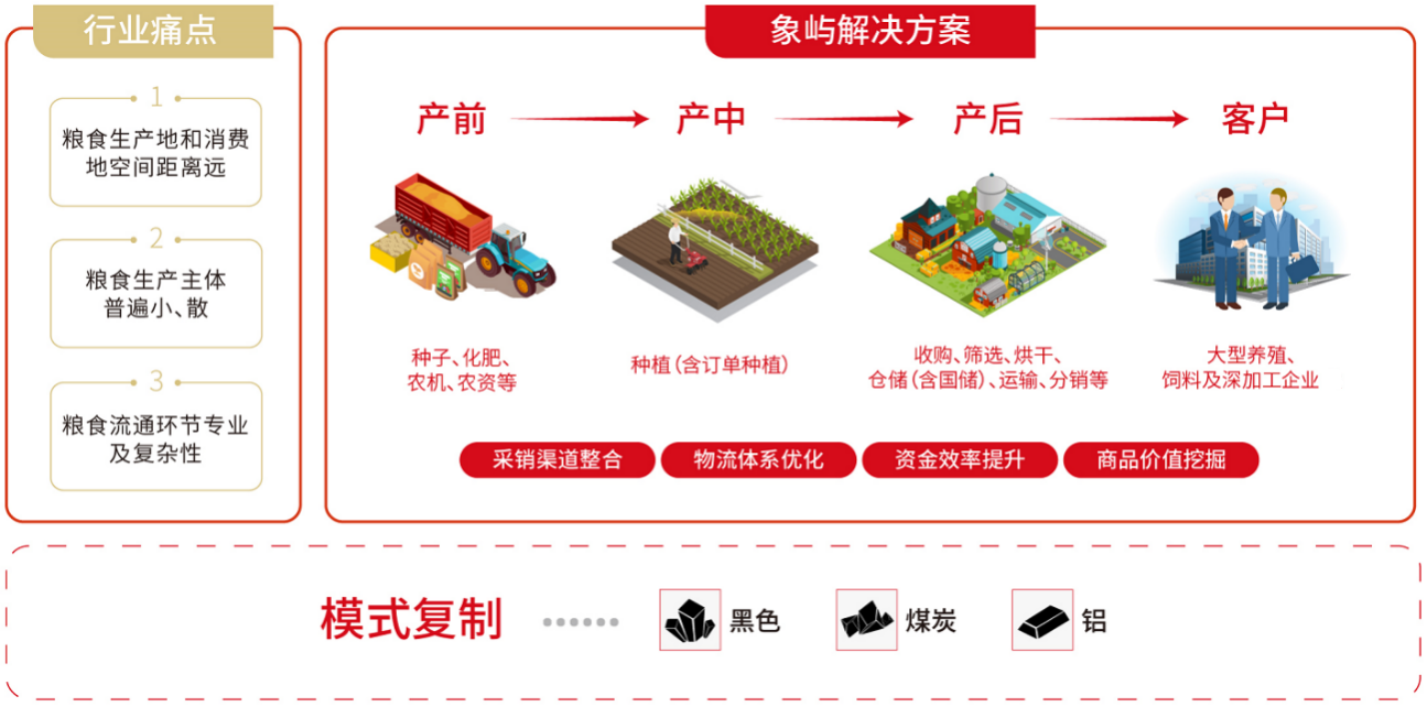 今年初,象嶼聯(lián)手阿里云結(jié)合東北農(nóng)業(yè)實(shí)際,攜手在糧食板塊先行先試建設(shè)農(nóng)業(yè)產(chǎn)業(yè)級(jí)互聯(lián)網(wǎng)平臺(tái)。該平臺(tái)將貫穿糧食產(chǎn)業(yè)鏈種植、倉(cāng)儲(chǔ)、流通三大環(huán)節(jié),借助物聯(lián)網(wǎng)、云計(jì)算、區(qū)塊鏈?zhǔn)侄螌?shí)現(xiàn)輕資產(chǎn)模式下倉(cāng)容快速擴(kuò)張,連接用糧方、金融、物流等生態(tài)方,提升全產(chǎn)業(yè)鏈貿(mào)易、物流與金融效率。 未來(lái),象嶼農(nóng)產(chǎn)將做深“一條鏈”,做大“一個(gè)園”,形成共創(chuàng)共享共贏的全產(chǎn)業(yè)鏈資源生態(tài)系統(tǒng),圍繞“雙循環(huán)”發(fā)展格局,進(jìn)一步優(yōu)化投資結(jié)構(gòu),延伸投資鏈條,創(chuàng)新產(chǎn)業(yè)模式,為鄉(xiāng)村振興、促進(jìn)農(nóng)業(yè)高質(zhì)高效發(fā)展貢獻(xiàn)力量!